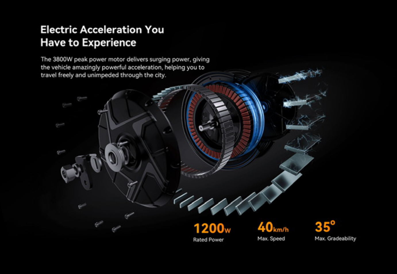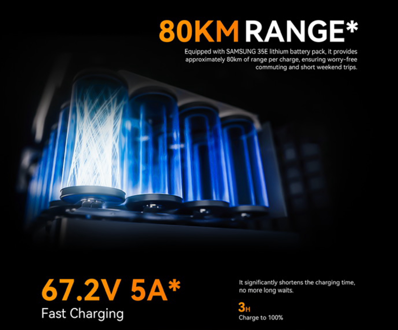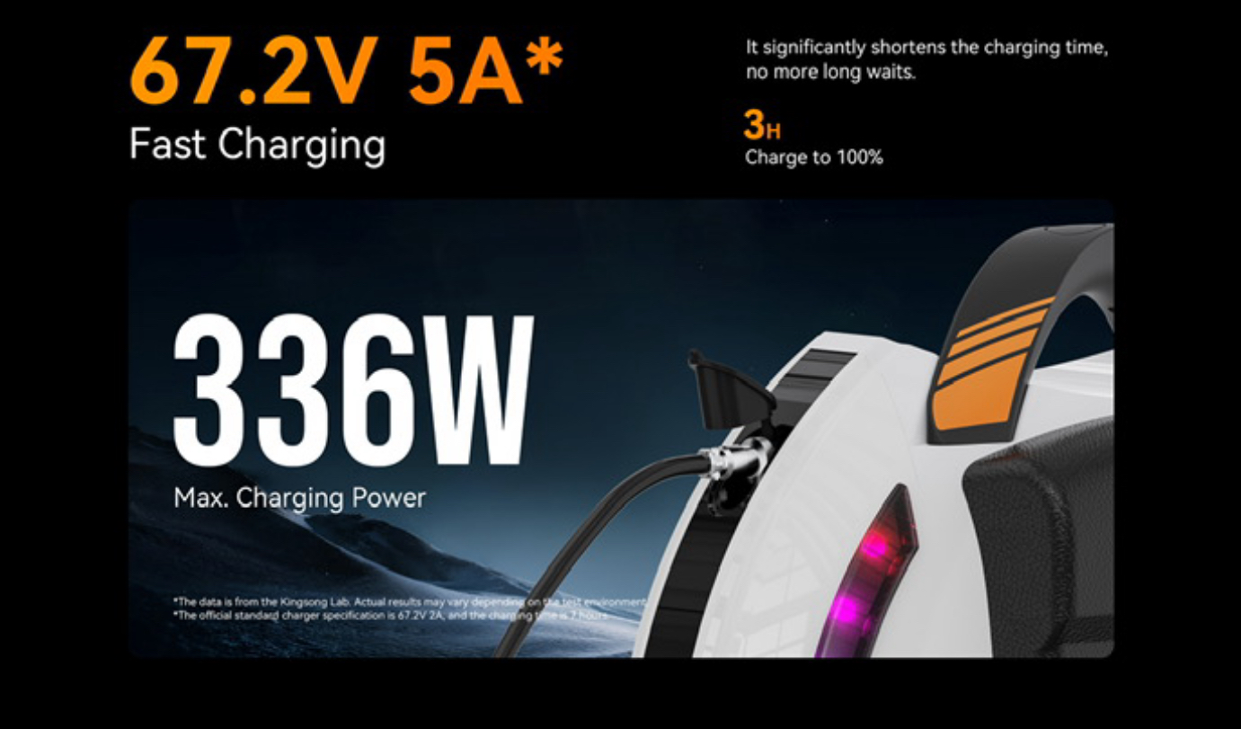 Cette gyroroue est équipée d’une batterie de 840 Wh lui permettant de parcourir jusqu’à 75 km avec une charge complète. Une batterie de 60V (67.2V) qui offre de belles performances en ville pour un temps de charge de 6 h 30. De même, le puissant moteur de 1200 W permet largement de passer grâce à son couple des pentes pouvant aller jusqu’à 30 degrés. Au niveau de la vitesse, cette dernière peut atteindre les 35 km/h maximum.