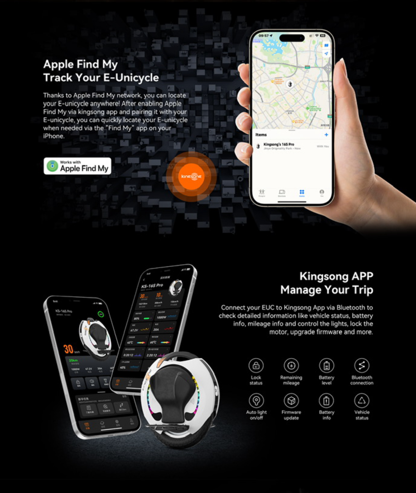 Tracker compatible Apple FindMy qui vous permet de suivre la localisation de votre gyroroue partout dans le monde.
