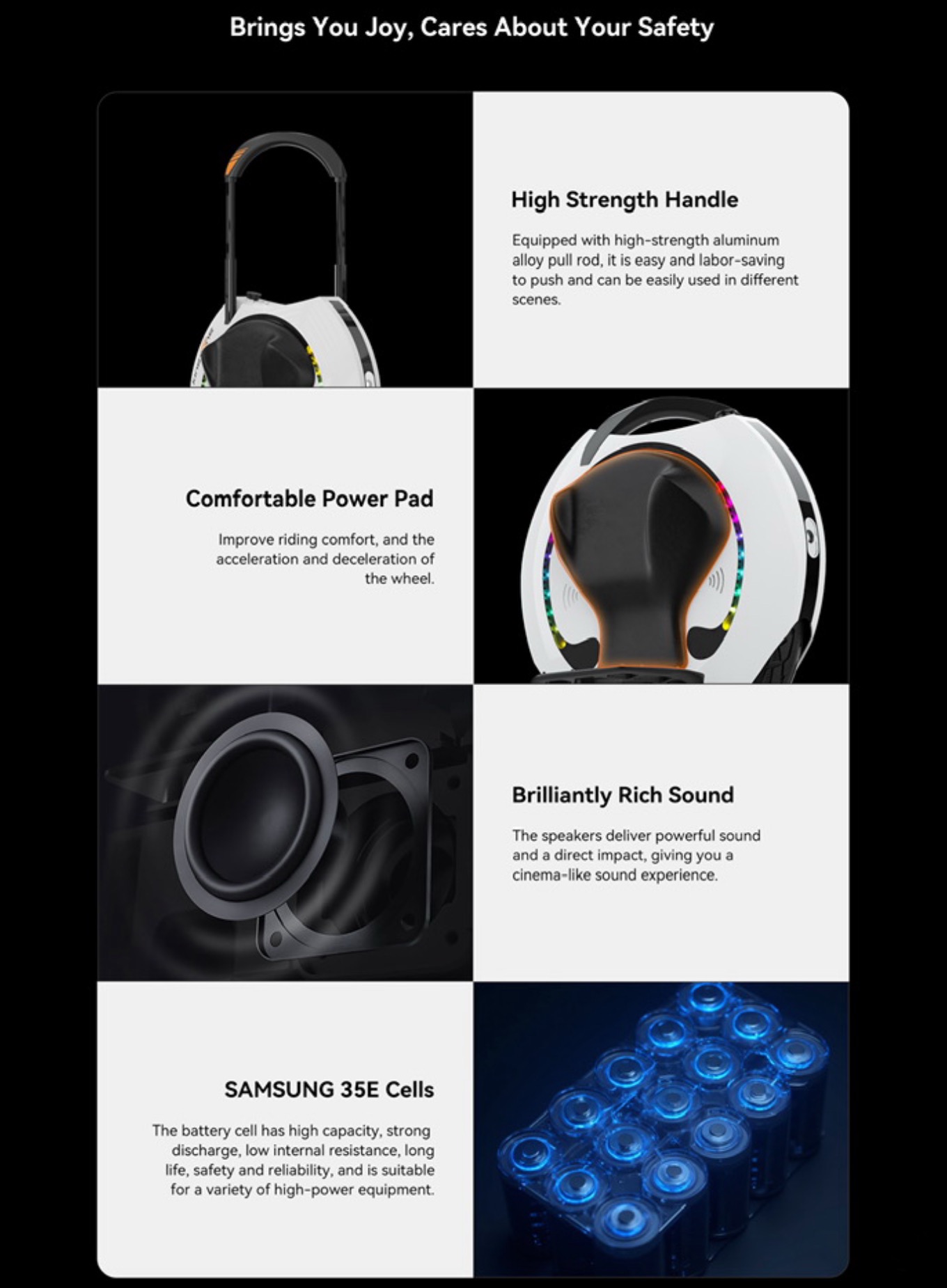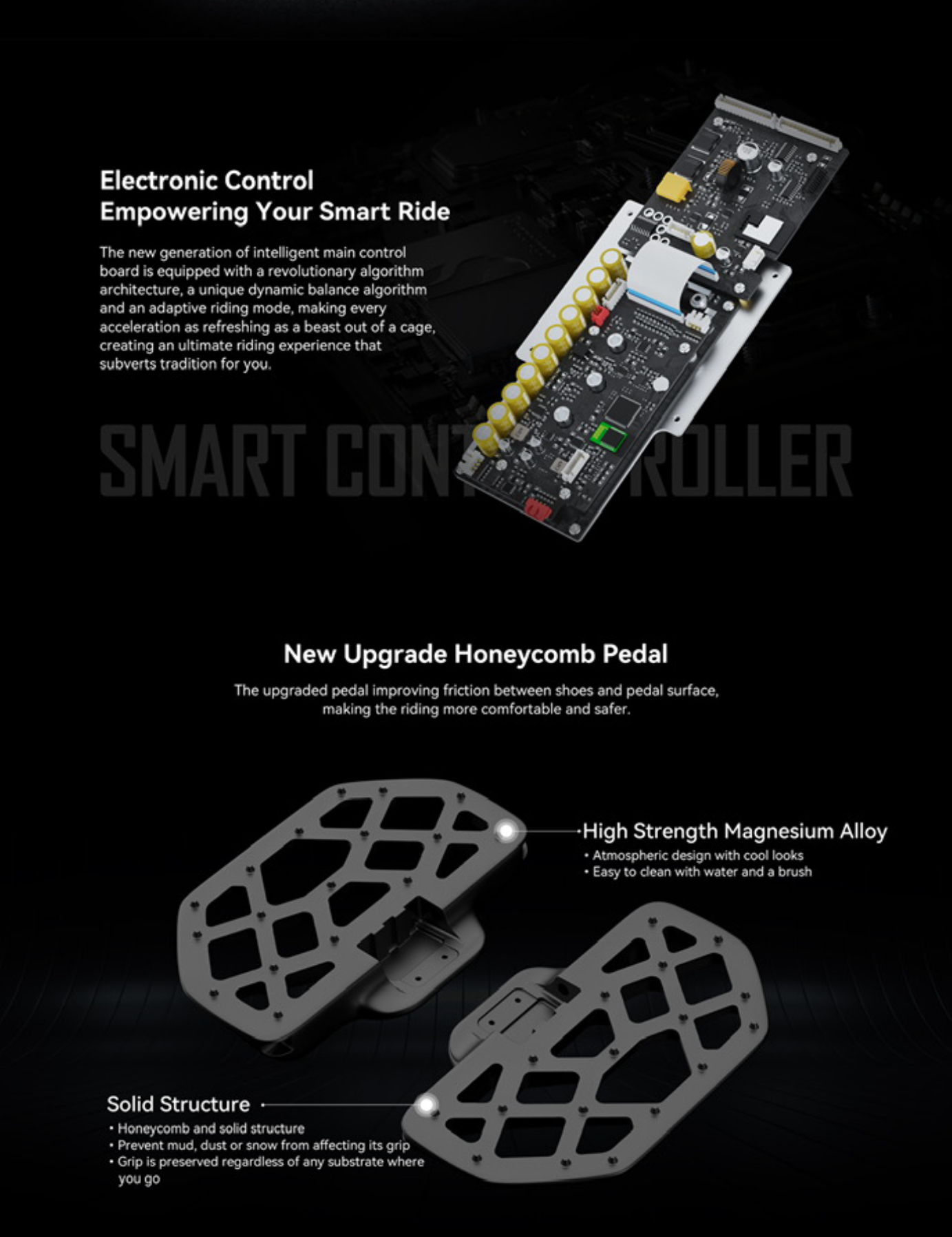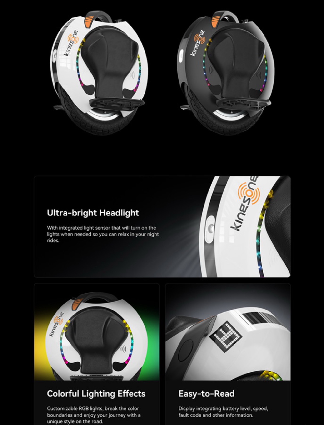 Les larges pédales en aluminium de la Kingsong KS-16S sont parfaitement équilibrées et munies d'un grip antidérapant qui, comme son nom l’indique, vous permet de ne pas glisser des pédales et vous évite les accidents. De même, les larges pads sur chaque côté de la roue vous garantissent un confort maximal durant votre conduite. En plus de ça, l’éclairage LED avant et arrière vous sera utile lors de vos déplacements nocturnes.