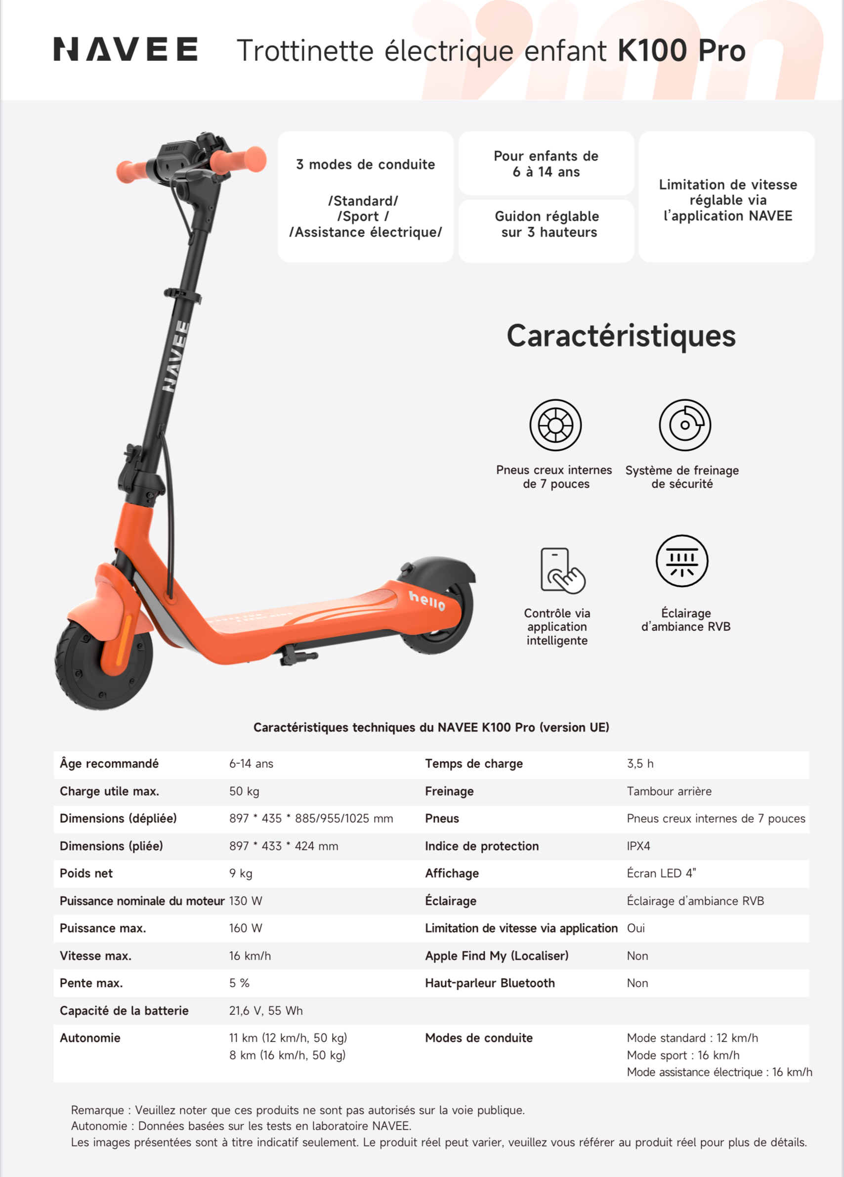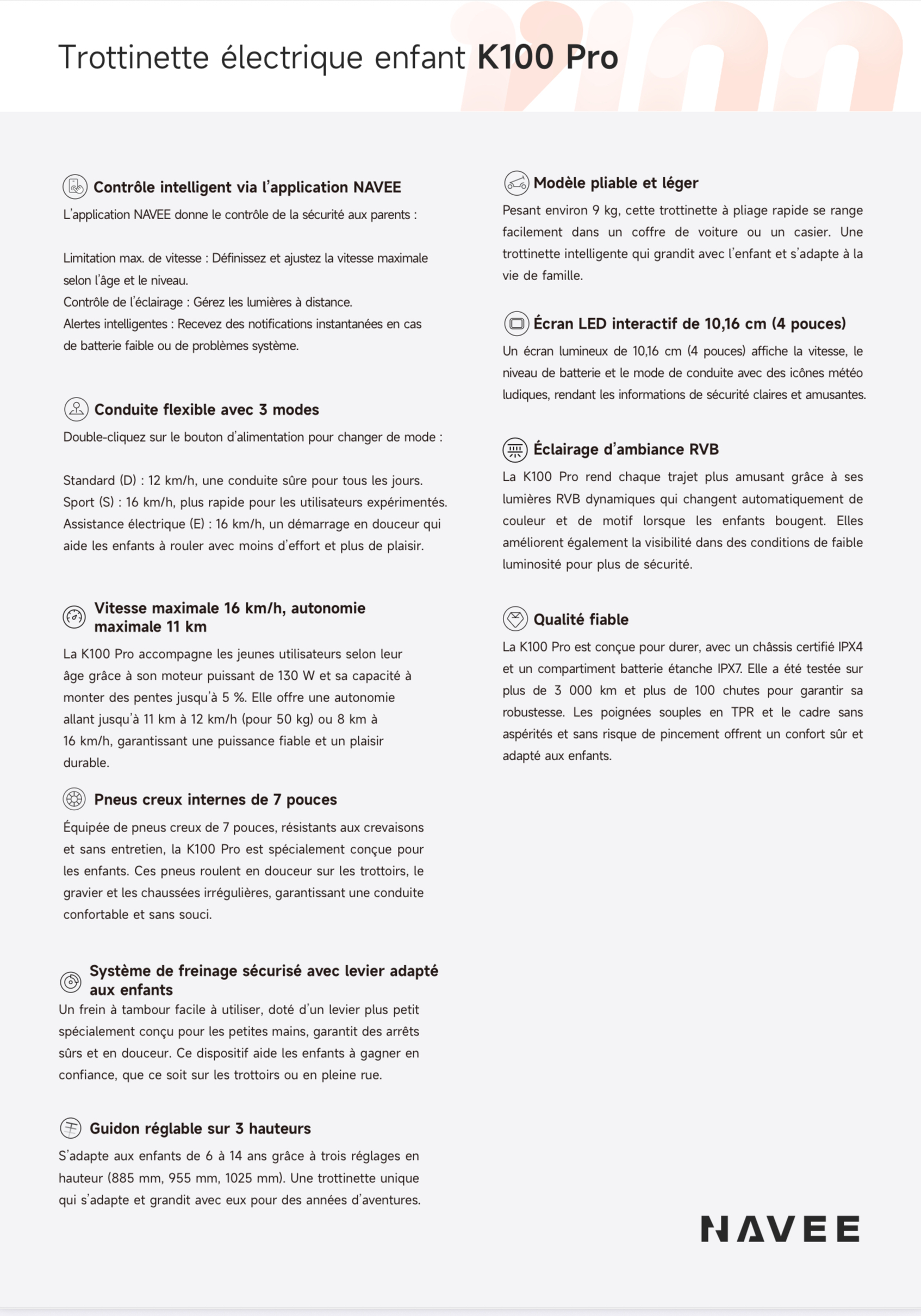Vitesse maximale de 16 km/h, autonomie maximale de 11 km Le K100 Pro accompagne les jeunes utilisateurs grâce à son moteur fluide de 130 W et sa capacité à gravir une pente de 5 %. Il offre jusqu'à 11 km d'autonomie à 12 km/h (50 kg) ou 8 km à 16 km/h, pour une puissance fiable et un plaisir durable. 7 pouces Pneus creux Équipée de pneus creux de 7 pouces, sans entretien et anti crevaison, la K100 Max est conçue spécialement pour les enfants. Ces pneus glissent en douceur sur les trottoirs, le gravier et les pavés...